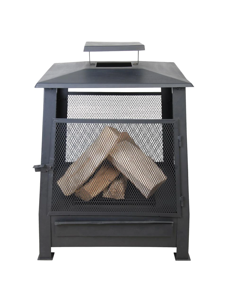 Braséro de terrasse style pagode avec pare-étincelles, porte et conduit d’évacuation.