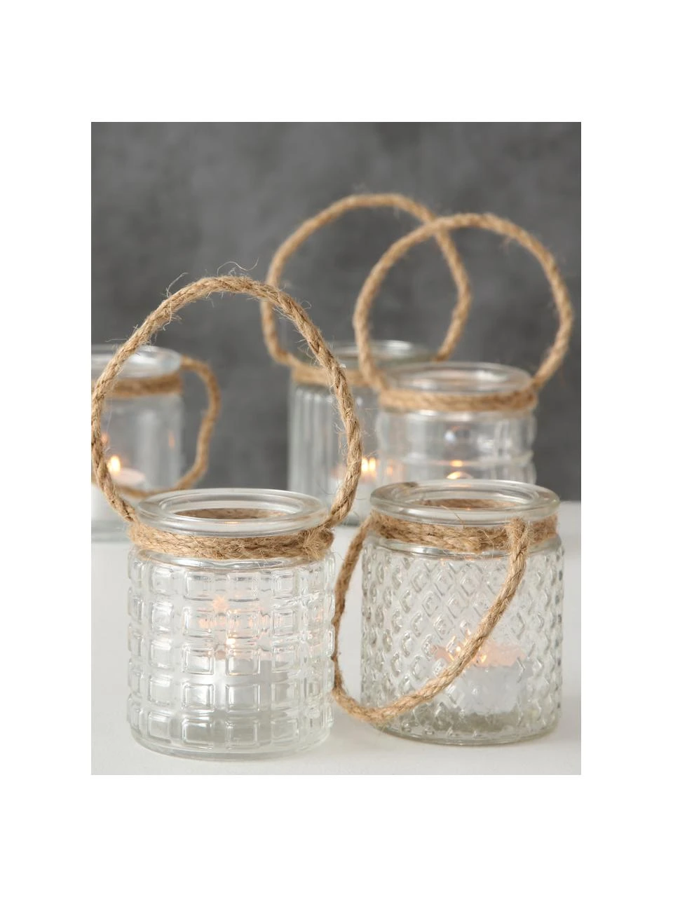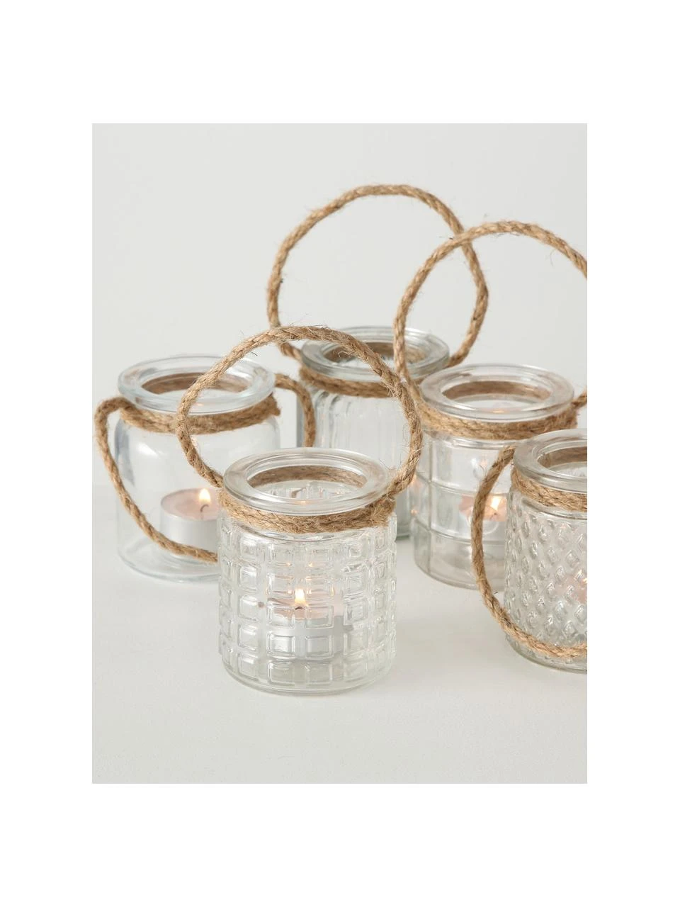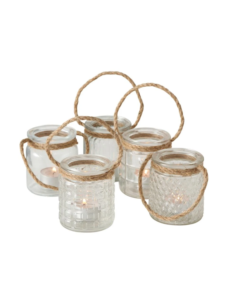 5 photophores pour des bougies chauffe-plat avec poignées en corde, de 5 designs différents