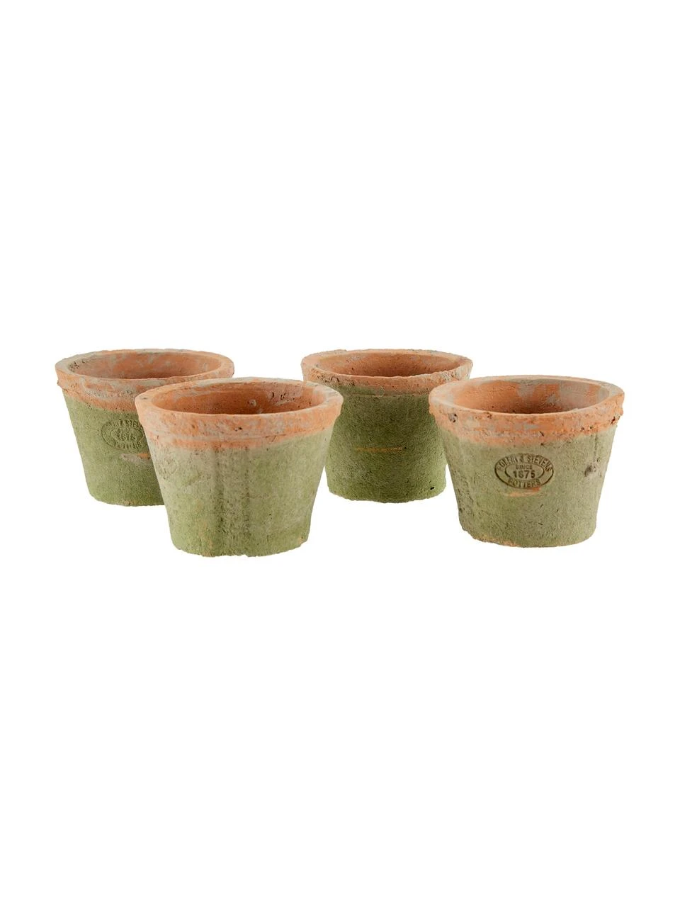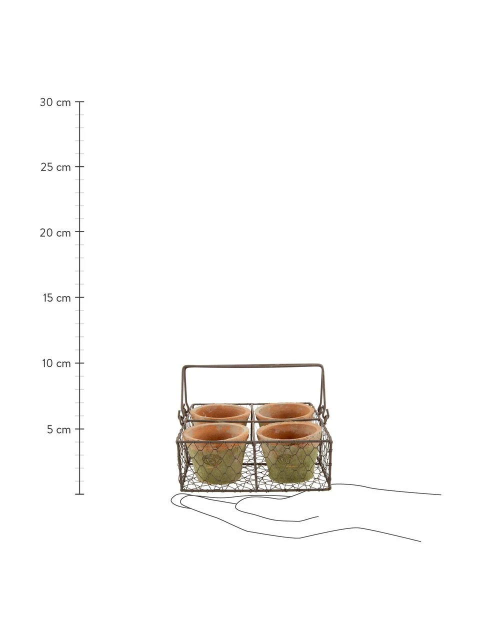 Ensemble à 5 élém. composé de 4 pots avec logo « Robert Stevens & Potters, Since 1875 », faits à la main, et d’1 panier en fils de fer. À protéger du gel
